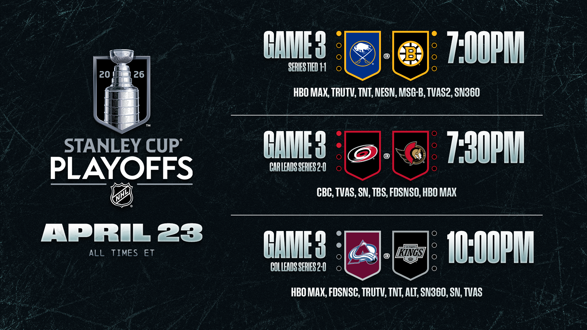 Thursday’s slate features three Game 3s with the Sabres and Bruins battling for a 2-1 series lead at TD Garden, while the Senators and Kings also shift to their home rinks with their sights set on capturing their first win of the 2026 Stanley Cup Playoffs.