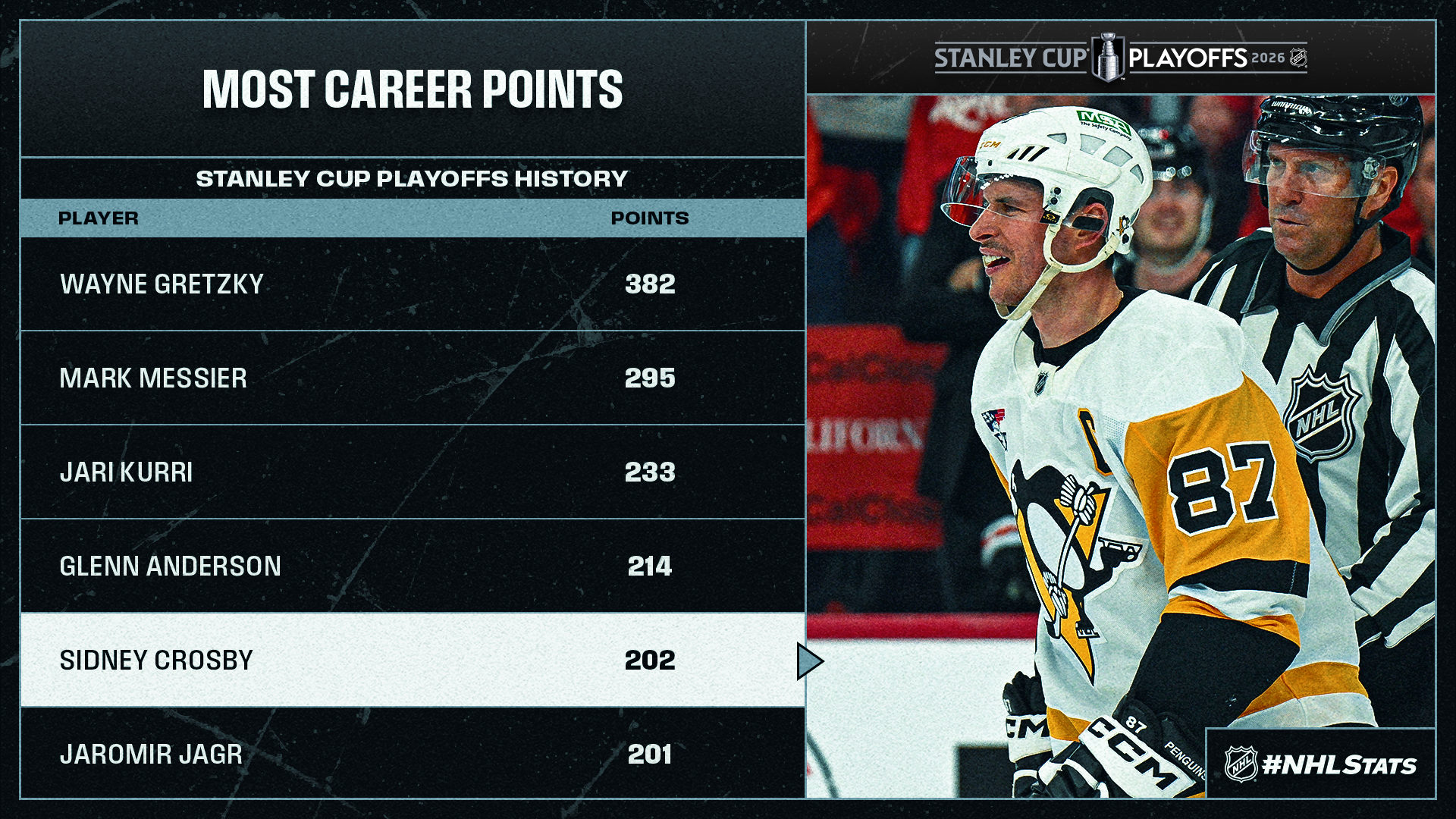 Wednesday’s edition of #NHLStats: Live Updates featured more notes from the three-game slate, including Sidney Crosby collecting an assist to reach 202 career postseason points and pass Jaromir Jagr (201) for fifth place on the League’s all-time list. Crosby also hit 99 career playoff road points and needs one to become the third player in NHL history with 100, following Wayne Gretzky (164) and Mark Messier (139), whose totals include the suspended game during the 1988 Stanley Cup Final.