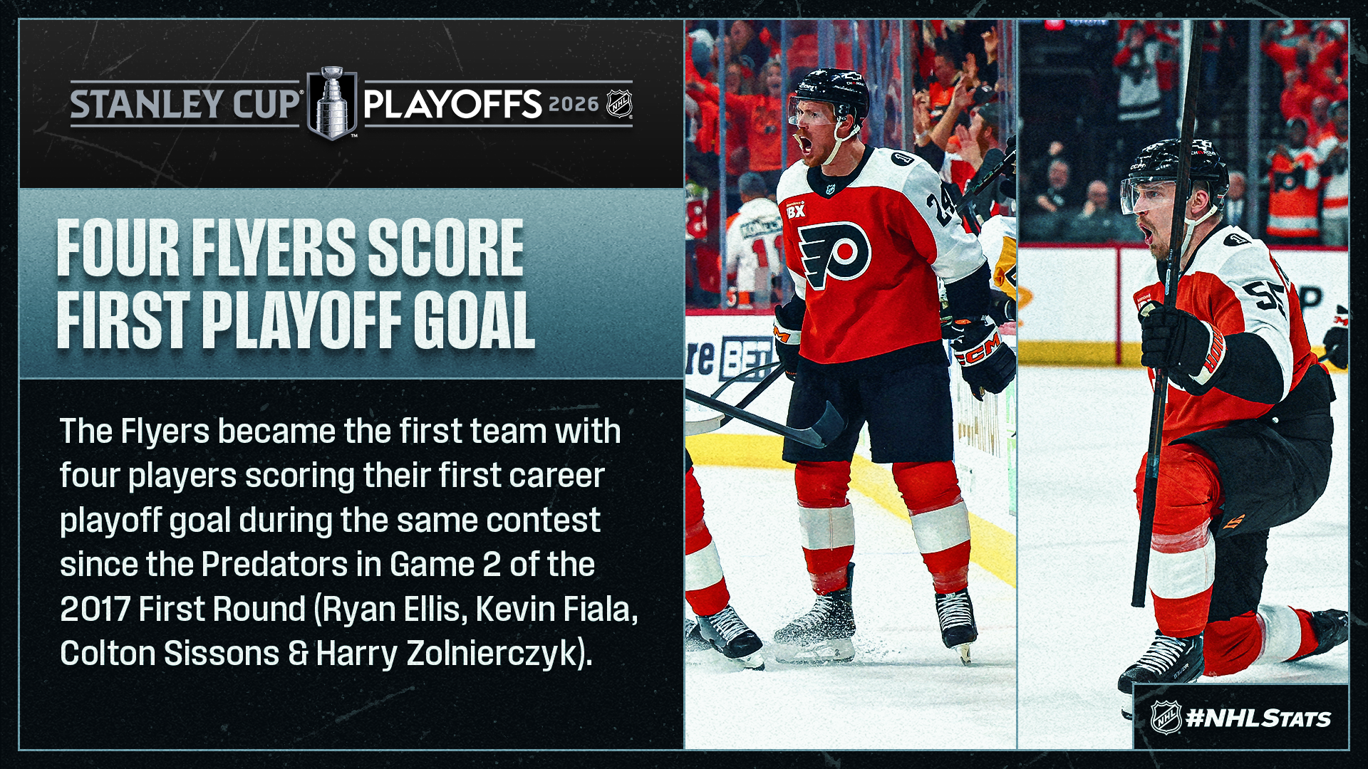 Trevor ZegrasRasmus RistolainenNick Seeler and Noah Cates all scored their first-ever goal in the Stanley Cup Playoffs, while Porter Martone extended his point streak to three games to propel the Flyers to a commanding 3-0 series lead. Philadelphia earned its first playoff win at Xfinity Mobile Arena since Game 4 of the 2016 First Round, when the venue was known as Wells Fargo Center, and own an all-time series record of 10-0 when leading 3-0 in a best-of-seven playoff round.