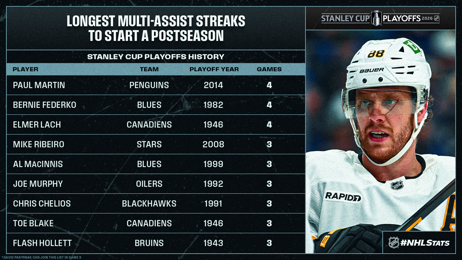 David Pastrnak (1-4—5) logged a pair of assists in Game 2 and is tied for the lead among players with five points this postseason. He can become the seventh skater in Bruins history to start a playoff run on a three-game multi-point streak and first to do so since Jean RatelleBobby Schmautz and Terry O’Reilly in 1977.