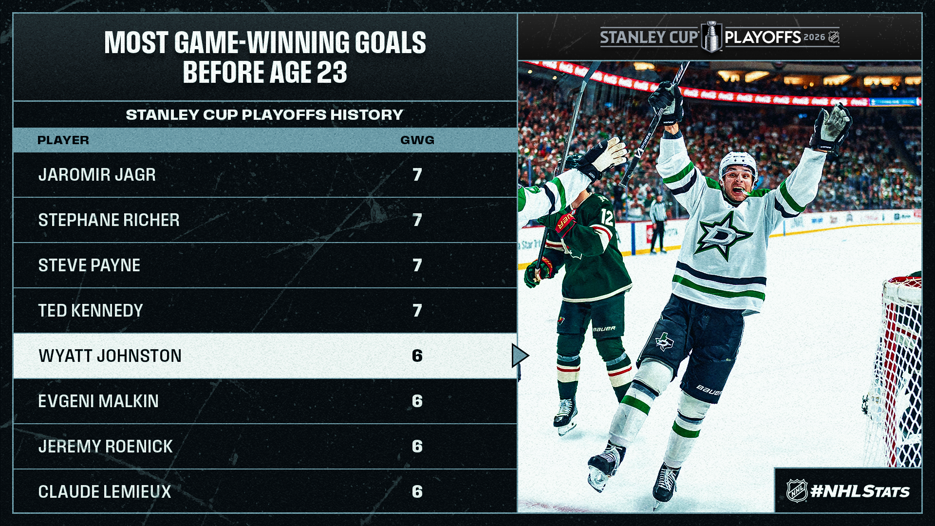 * Johnston scored his sixth career game-winning goal in the playoffs and moved into a tie with Tyler SeguinJoe PavelskiJamie Langenbrunner and Brett Hull for the sixth most in Stars/North Stars history. The goal marked Johnston’s second point of the game, making him the first player in Stars team history (since 1993-94) to record consecutive multi-point contests in the playoffs at age 22 or younger. Only one player has achieved a longer such streak with the franchise before age 23: Steve Payne (4 GP w/ MNS in 1981).