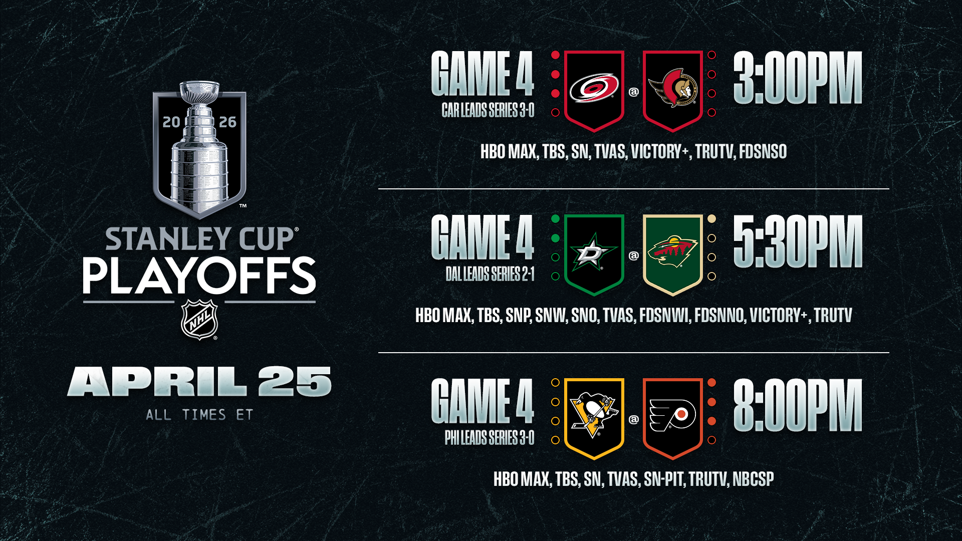 * A three-game Saturday in the 2026 Stanley Cup Playoffs features a tripleheader on TNT that sees the Senators and Penguins both attempt to keep their Second Round hopes alive when they face the Hurricanes and Flyers, respectively, while the Stars look to push the Wild to the brink.