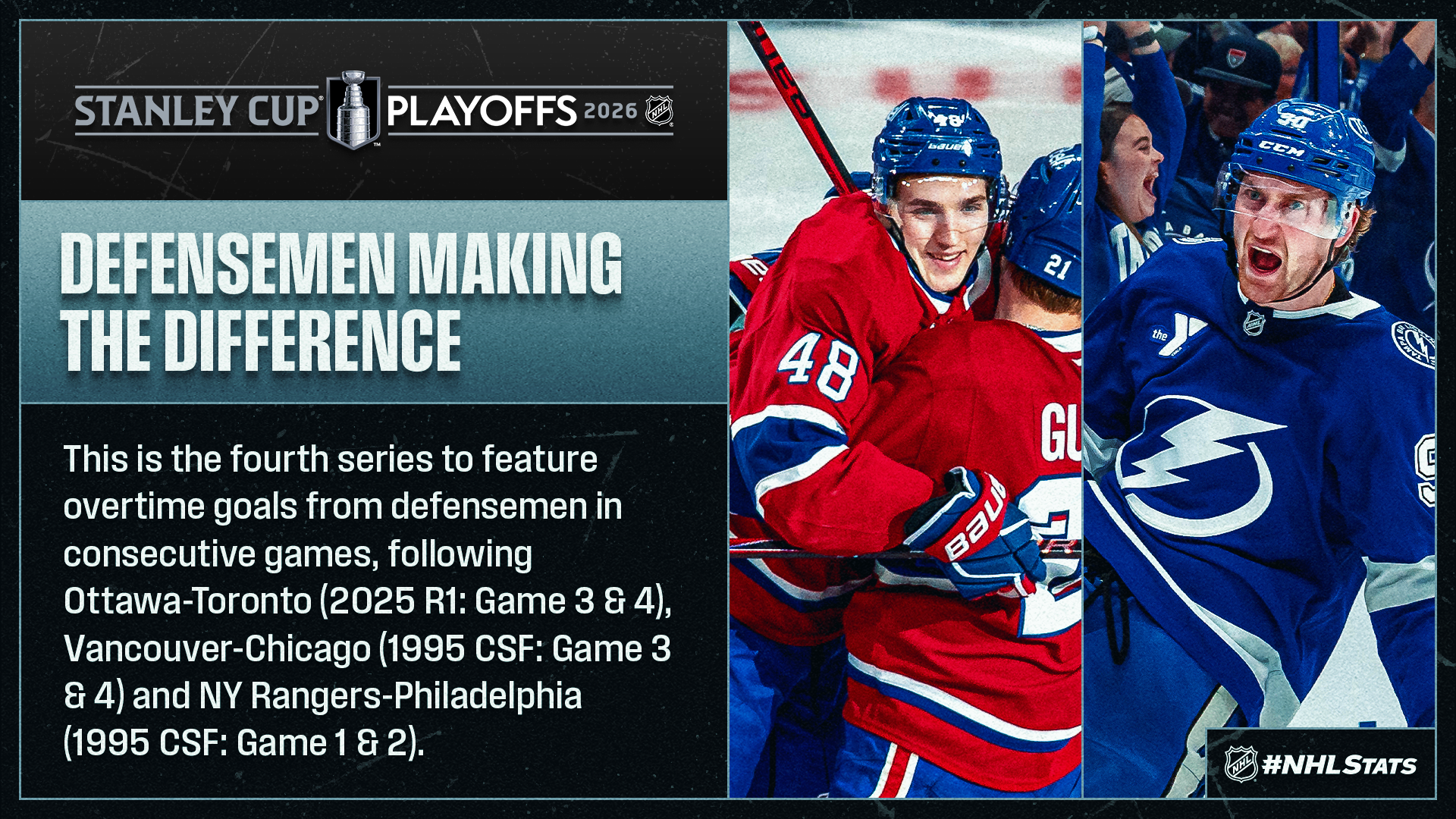* The Canadiens and Lightning have required overtime for all three contests so far in the First Round, with defensemen netting the winners in Game 2 and 3. The only teams to play more consecutive overtime games in a single series are Phoenix-Chicago (Game 1-5 in 2012 CQF), Montreal-Toronto (Game 1-5 in 1951 SCF) and Carolina-Nashville (Game 3-6 in 2021 R1).