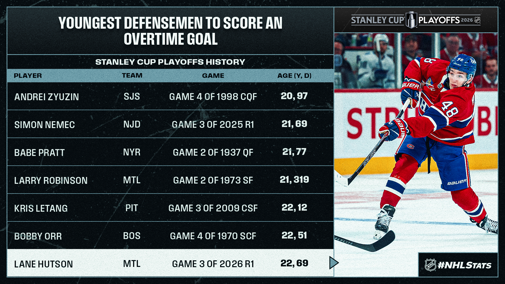 * Lane Hutson became the seventh-youngest defenseman in Stanley Cup Playoffs history to play overtime hero as the Canadiens broke their series deadlock in front of an electric crowd at Bell Centre.