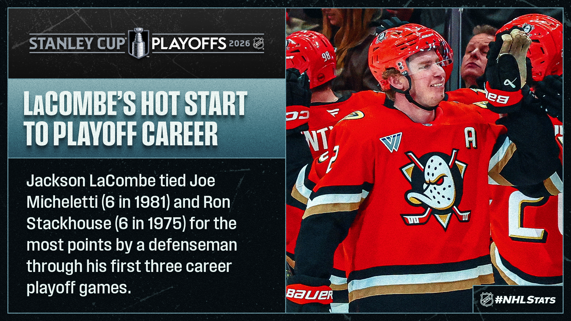 * LaCombe boosted his 2026 postseason totals to 1-5—6 (3 GP) and became the third defenseman in Ducks history to find the score sheet in each of his first three playoff games with the franchise, following Ryan Whitney (4 GP in 2009) and J.J. Daigneault (3 GP in 1997). He also became the third Ducks blueliner with consecutive multi-point playoff outings, joining Chris Pronger (2 GP in 2009 & 2007) and Daigneault (2 GP in 1997).