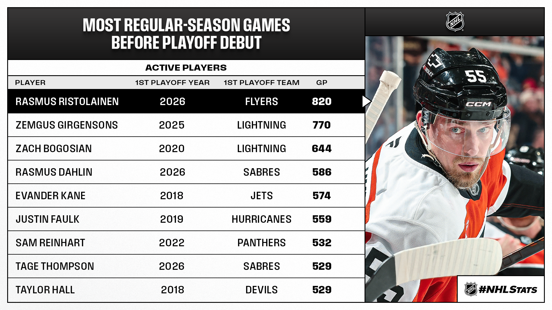The Sabres have never won the Stanley Cup in their 55-season history, marking the longest wait of any team in the postseason and the second-longest drought in the NHL behind only the Maple Leafs (58 seasons since 1967). The Flyers are also in the midst of a 50-plus year drought following their back-to-back Stanley Cup wins in 1974 and 1975.