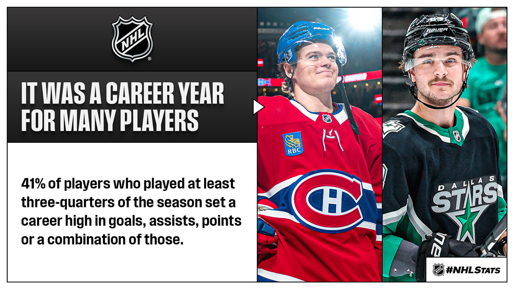 * It was a historic year on many fronts as 15 teams had a major all-time or single-season scoring record broken or matched. Among the highlights not mentioned elsewhere in this recap: Auston Matthews (TOR) and Kirill Kaprizov (MIN) set career goals records; Mark Scheifele (WPG) set career and single-season points records and also became the franchise leader in games played; Jared Spurgeon (MIN) became the franchise leader in assists and points by a defenseman; while New York teams had records set by Mika Zibanejad (NYR; power-play goals), Ilya Sorokin (NYI; career shutouts, tied single-season) and Matthew Schaefer (NYI; a long list).