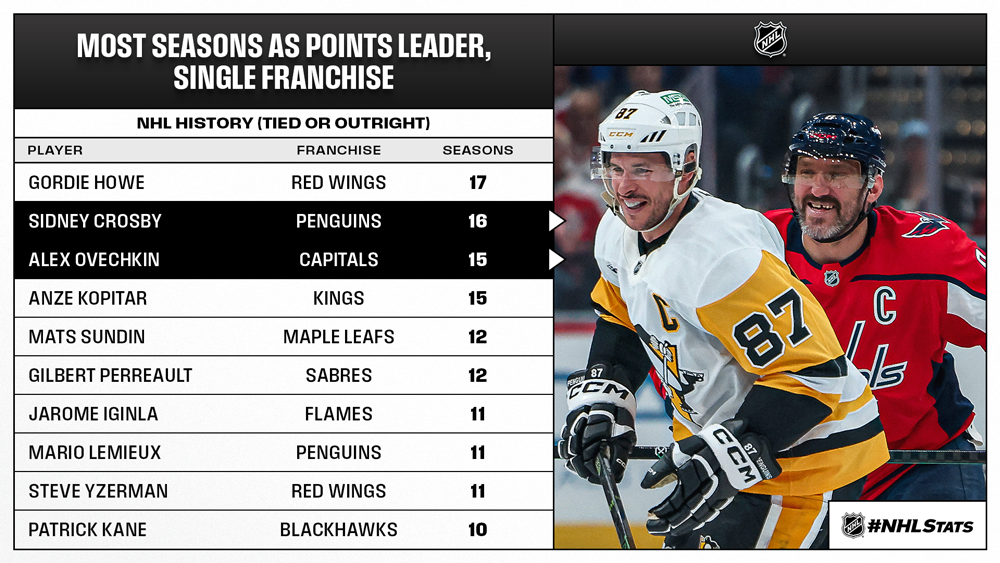 * Crosby (16x, all w/ PIT) now trails only Wayne Gretzky (19x; 9 w/ EDM, 7 w/ LAK, 3 w/ NYR) and Gordie Howe (17x, all w/ DET) for the most seasons as any team’s points leader – with Ovechkin (15, all w/ WSH) and Anze Kopitar (15x, all w/ LAK) right behind them. From a single franchise perspective, Crosby moved within one campaign of matching Howe’s mark set with Detroit.