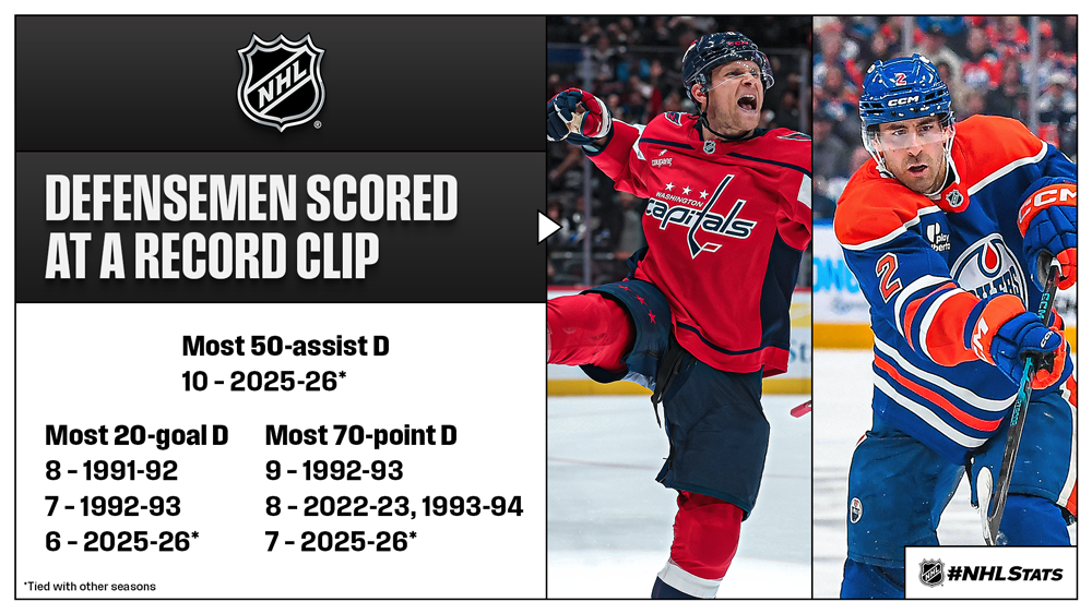 * The list of NHL leaders from the defensive end was a mix of established veterans and newcomers, with Evan Bouchard (EDM) topped all blueliners in assists (74) and points (95) – the second Oilers defenseman to top both lists after Paul Coffey (4x) – while Jakob Chychrun (WSH) had 26 goals (including an NHL record-tying 8 GWG) to finish ahead of second-place Matthew Schaefer (NYI) and pace a group of six 20-goal scorers from the back end – the most the NHL has seen in 32 years.