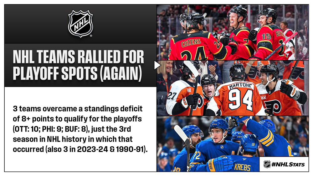 * The Senators overcame the largest standings deficit of any club that made the 2026 Stanley Cup Playoffs – sitting 10 points out as late as Jan. 30. Ottawa is the only playoff team to qualify after ranking last place in its division after the holiday break in 2025-26 (most recently Feb. 4).