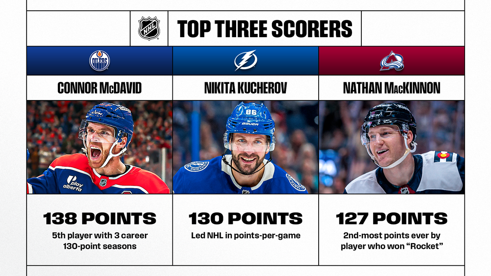 For a second time in three years, the combination of Connor McDavid (EDM; 138 points), Nikita Kucherov (TBL; 130) and Nathan MacKinnon (COL; 127) finished as the top three in the Art Ross Trophy race – just the third grouping in League history to rank 1-3 in League scoring multiple times (any order). The three players combined to lead the Art Ross Trophy race for 138 of 167 game days in 2025-26 (79%; McDavid: 72; MacKinnon: 60; Kucherov: 6), including 136 in a row from Nov. 8 onward. The last player to lead before that trio took over was 19-year-old Macklin Celebrini (SJS; through Nov. 7), who finished his second NHL season ranked fourth in League scoring.