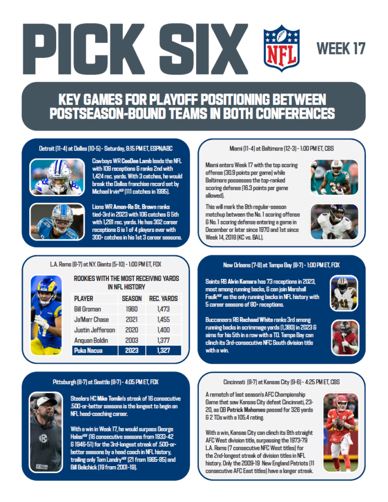 FootballNFL Pick Six: Week 17 By NFL Editor - December 29, 2023 0 136 FacebookTwitterPinterestWhatsAppLinkedinReddItEmailPrint