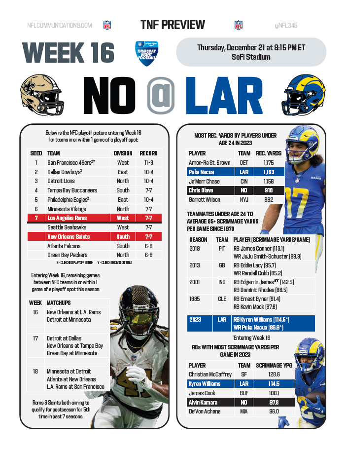 FootballNFL Thursday Night Preview – New Orleans Saints at Los Angeles Rams By NFL Editor - December 21, 2023 0 113 FacebookTwitterPinterestWhatsAppLinkedinReddItEmailPrint