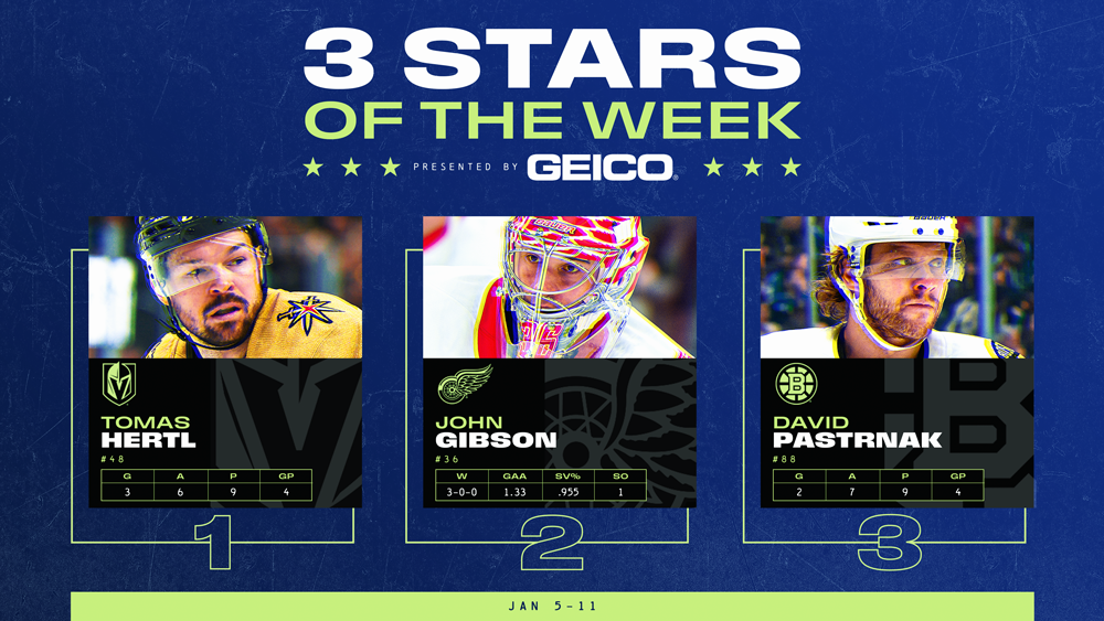 NEW YORK – Vegas Golden Knights center Tomas Hertl, Detroit Red Wings goaltender John Gibson and Boston Bruins right wing David Pastrnak have been named the NHL’s “Three Stars” presented by GEICO for the week ending Jan. 11.
