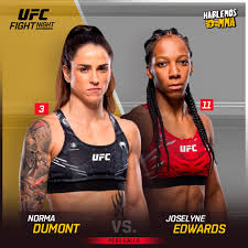 This is the first meeting between the two. Dumont has never been knocked out or submitted in the UFC. Edwards has been finished only twice in her last 10 fights but has evolved significantly since those losses. The bout was originally booked as Dumont vs. Yana Santos before the late replacement.